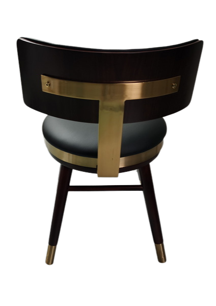 La chaise Nitro se démarque par son design contemporain et minimaliste. Son assise ronde rembourrée en cuir synthétique marron offre un confort optimal, tandis que son dossier légèrement incliné soutient parfaitement le dos. La ceinture dorée autour de l’assise et les embouts dorés aux pieds ajoutent une touche sophistiquée, contrastant harmonieusement avec la structure en bois foncé.