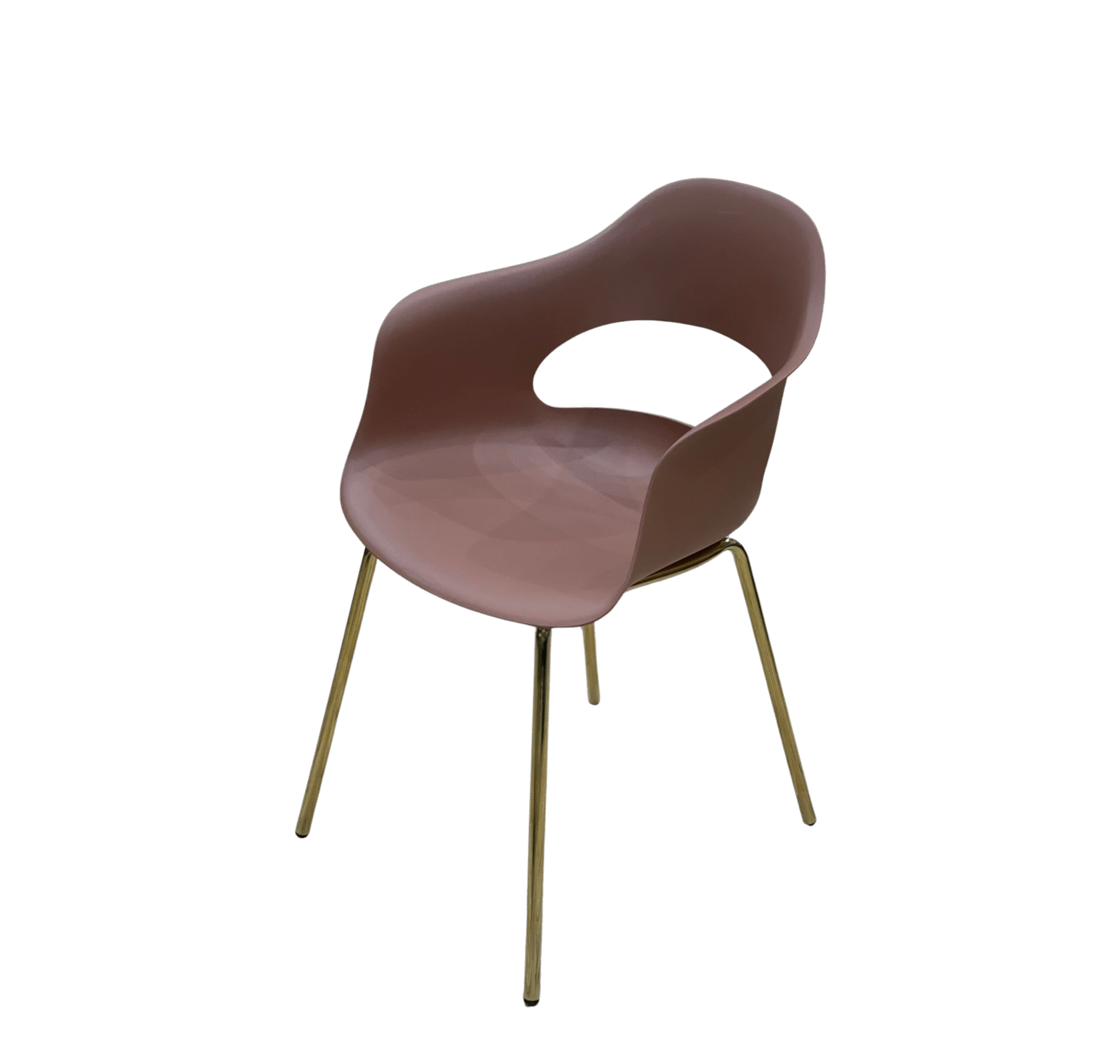 Fauteuil au design moderne et fluide, avec coque ergonomique enveloppante et ouverture élégante au dossier. Son piètement en métal finition dorée apporte une touche chic et assure stabilité et durabilité. Idéal pour salles à manger, restaurants et espaces contemporains.