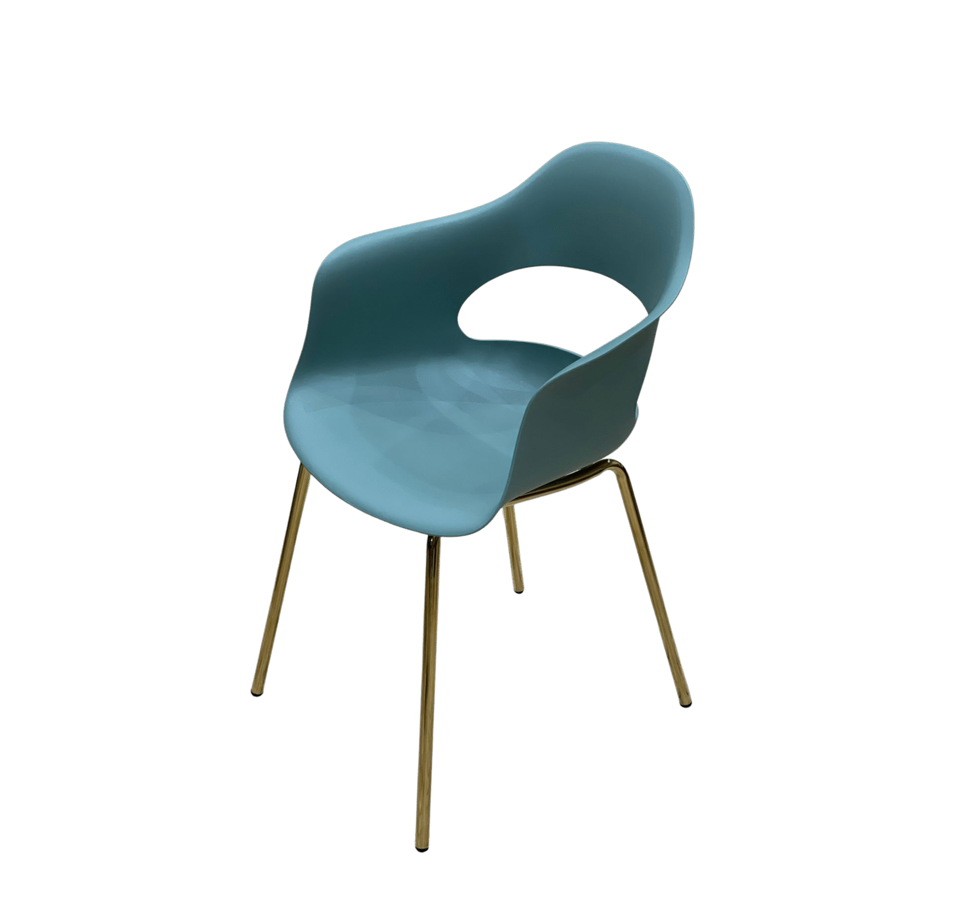 Fauteuil au design moderne et fluide, avec coque ergonomique enveloppante et ouverture élégante au dossier. Son piètement en métal finition dorée apporte une touche chic et assure stabilité et durabilité. Idéal pour salles à manger, restaurants et espaces contemporains.
