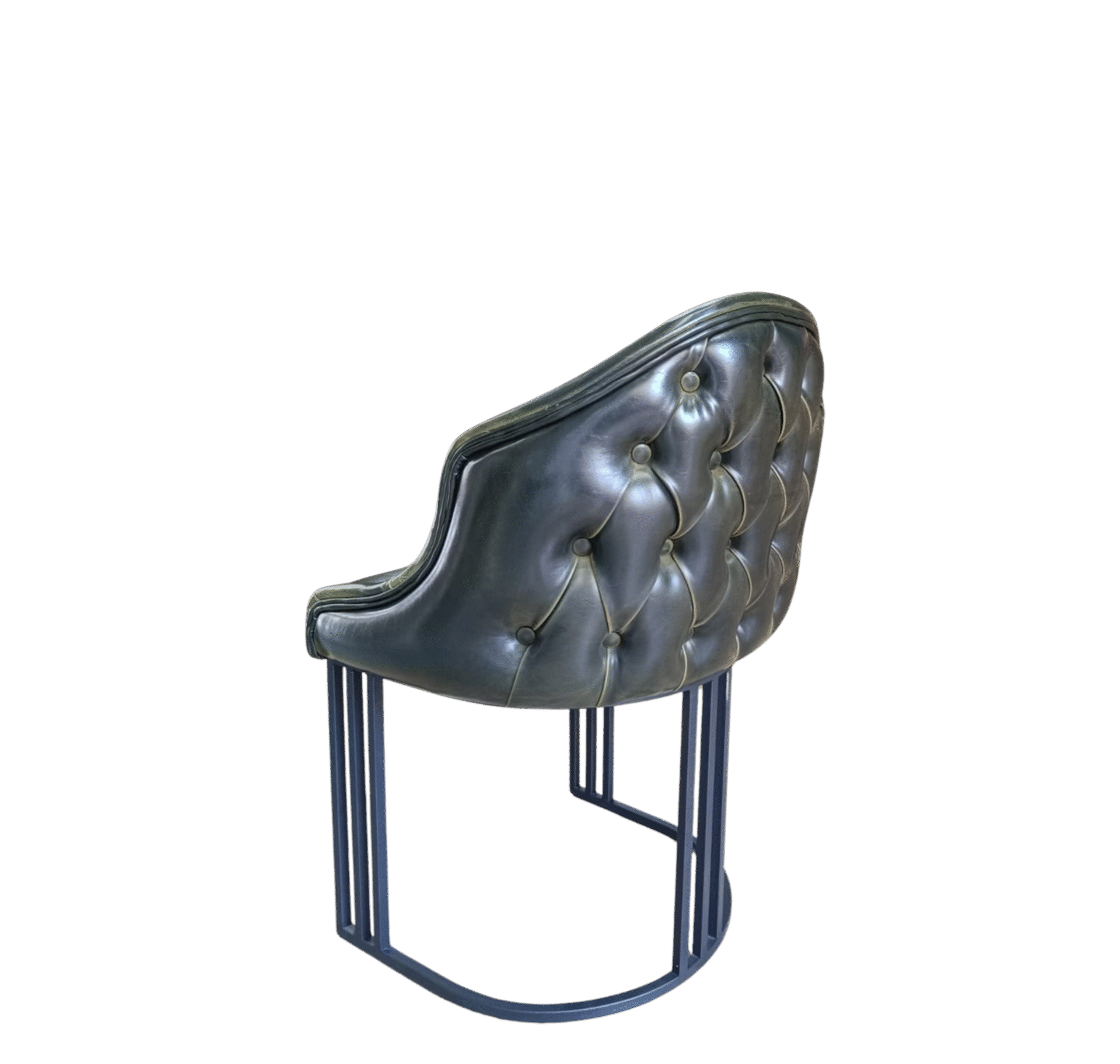 le fauteuil Lusso se distingue par son assise en simili cuir synthétique vert foncé et sa structure métallique au design architectural, offrant un style luxueux et affirmé.