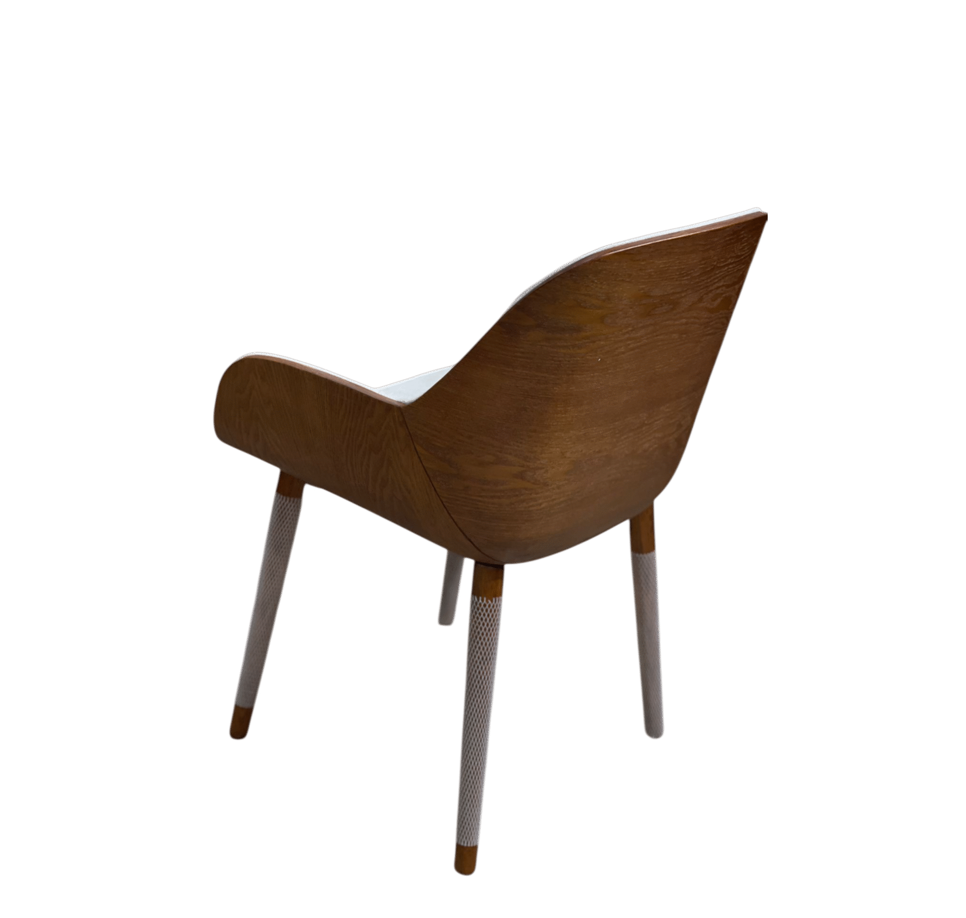 - Structure et Pieds : La structure apparente de la coque est en bois courbé teinté (souvent noyer ), offrant une finition élégante et robuste. Les pieds sont effilés, généralement dans une teinte assortie au reste de la structure, comme le noyer ou un marron foncé laqué.