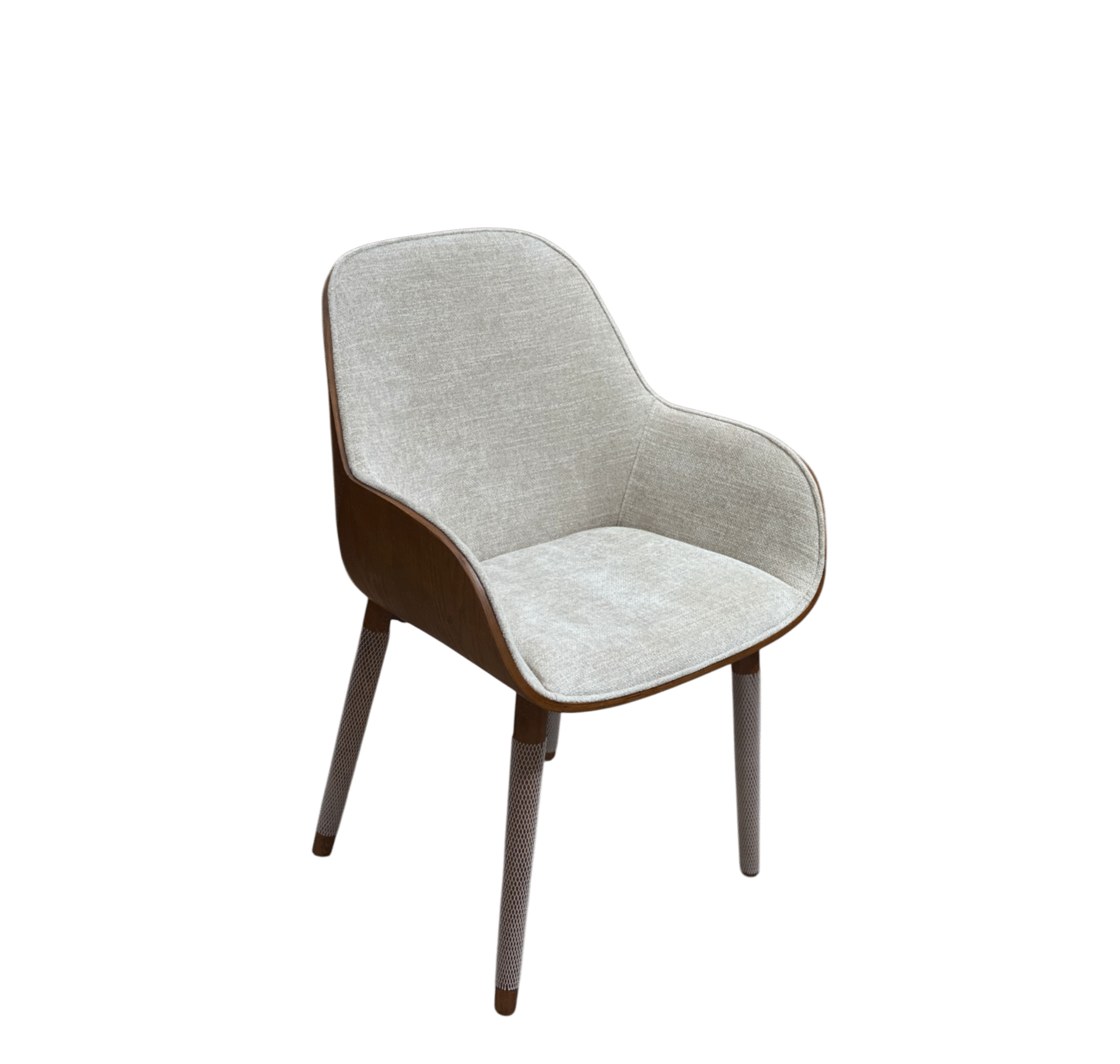 - Structure et Pieds : La structure apparente de la coque est en bois courbé teinté (souvent noyer ), offrant une finition élégante et robuste. Les pieds sont effilés, généralement dans une teinte assortie au reste de la structure, comme le noyer ou un marron foncé laqué.