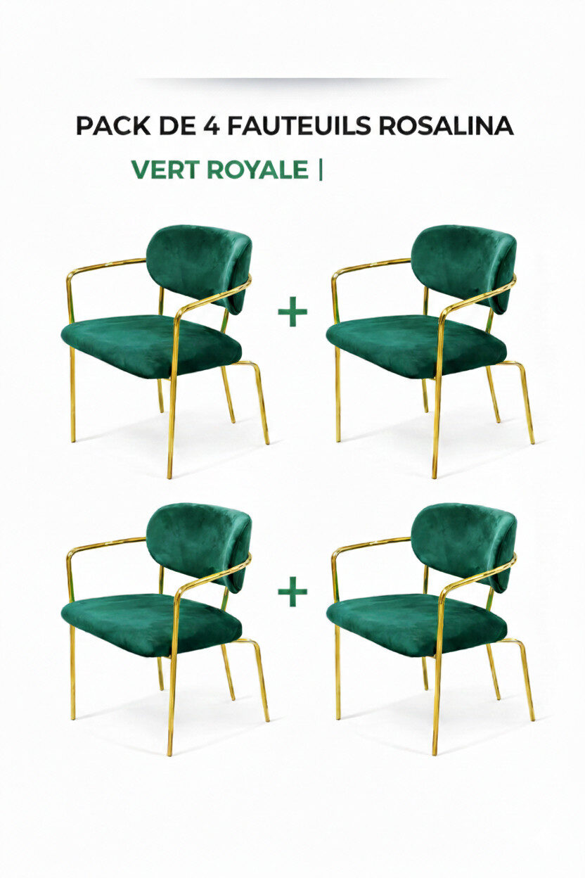 Apportez une touche de prestige à votre intérieur avec le Pack Rosalina. Ce lot de 4 fauteuils combine l’intensité d’un velours Vert Royal et l’éclat d’une structure dorée pour un rendu résolument chic et moderne.
