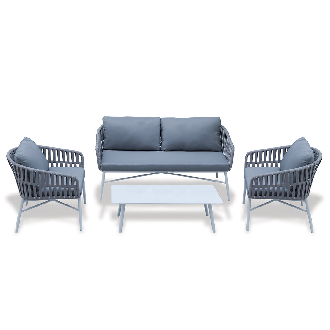 Cet ensemble se compose d’un canapé 2 places, de deux fauteuils confortables et d’une table basse assortie, créant un espace convivial idéal pour recevoir ou se détendre. Les coussins épais et moelleux offrent un excellent maintien et un confort durable, parfait pour profiter pleinement de vos moments en plein air.